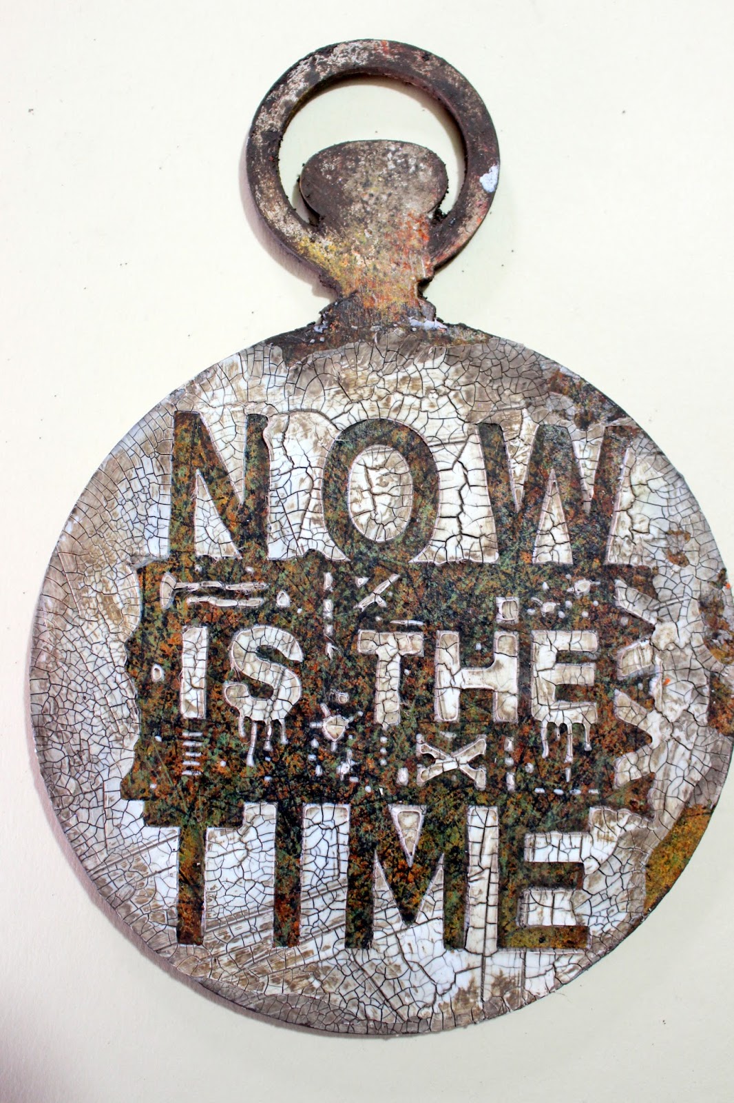 What a great challenge! This has provided me with just the opportunity, to carry out a little project I've had in mind since I purchased a Seth Apter stencil, with the message 'Now is the Time'. I am a great one for procrastinating, so these words hold a lot of meaning for me. The finished piece will hang on the door to my craftroom and will remind me how precious time is. This is how I put it together.........