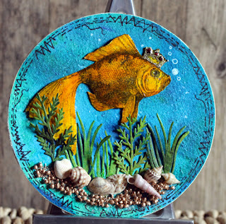I also adhered a sprinkling of Art Stones, to anchor the plants. I coloured the stones with a solution of Ancient Copper Pixie powder. One of the lovely things about powdered mediums such as Brushos, Pixie powders and of course Paperartsy Infusions, is that as well as sprinkling the dry powders to create different effects, you can also mix them with a little in water and use them with a paint brush or dip pen. I then turned my attention to the star of my little sea scene. I used one of my 'lockdown' purchases, a gorgeous regal fish stamp from La Blanche. I stamped 'her' with black Archival Ink, and coloured her with Zig Watercolour Pens. I then cut around the fish and used a ball tool to add dimension.......